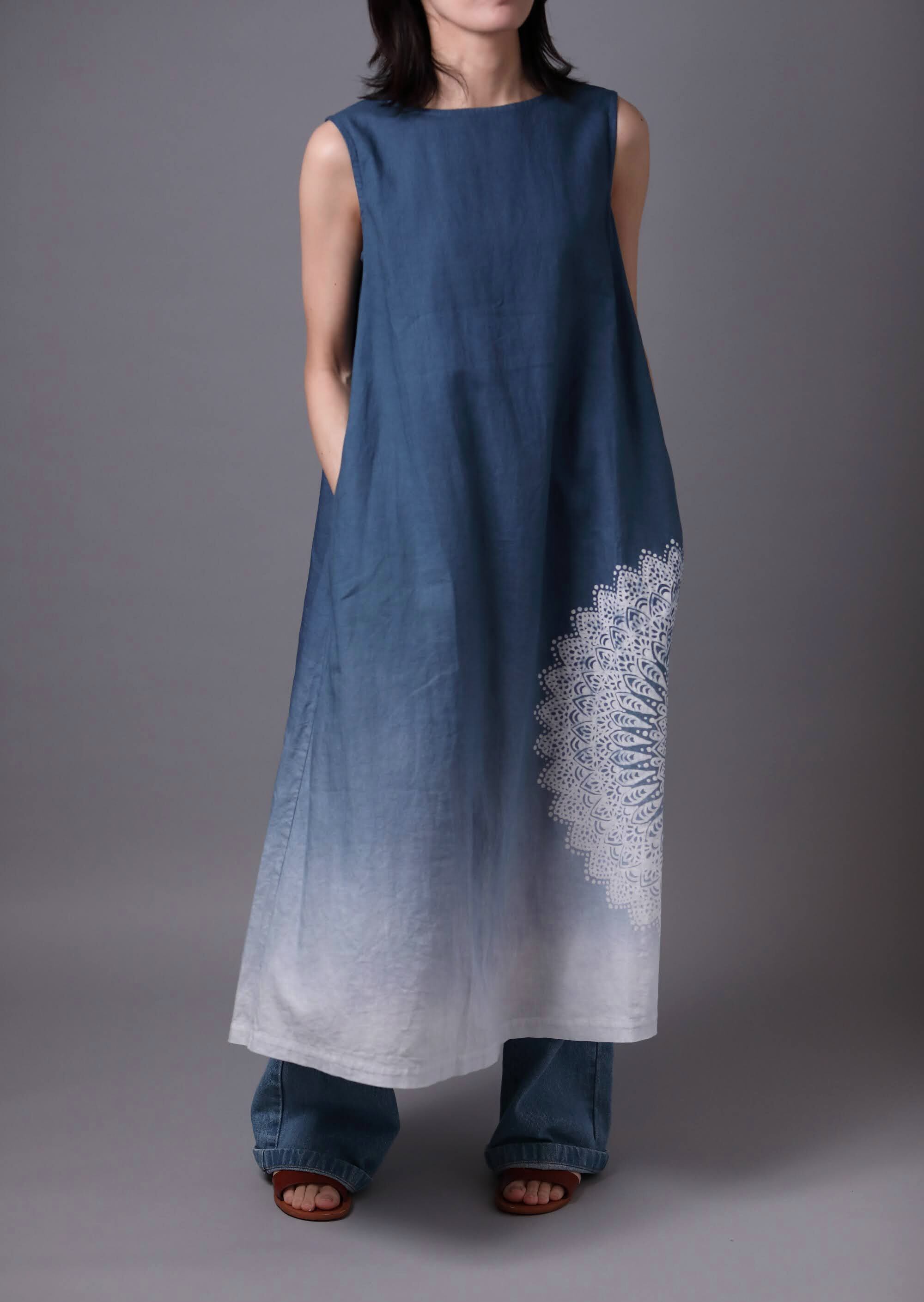 伝統的な染色法のろうけつ染めで手描き・手染めした、Aラインのロングワンピース。